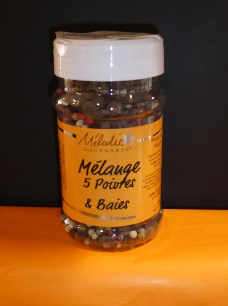 Le mélange 5 baies est une composition de 3 poivres (vert, noir et blanc) et de 2 faux poivres (baie rose et poivre de la Jamaïque). Son goût se partage entre le piquant des différents poivres et la touche sucrée de la baie rose, ce qui crée en bouche une explosion de saveurs entre piquant et mordant avec une touche d’agrume et de menthe.