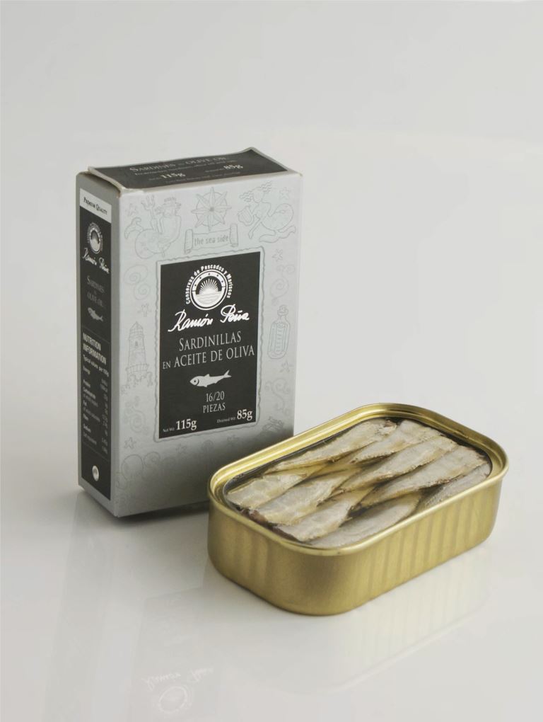 Les petites sardines, également appelées Sardinillas. Ramon Pena sélectionne les meilleurs arrivages au port de pêche et à l’usine les sardines sont étêtées, éviscérées, grillées et mises en boite artisanalement puis recouvertes d’huile d’olive d’une qualité supérieure.